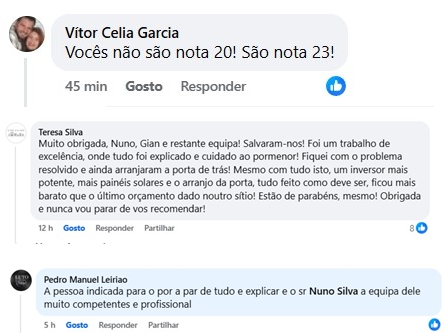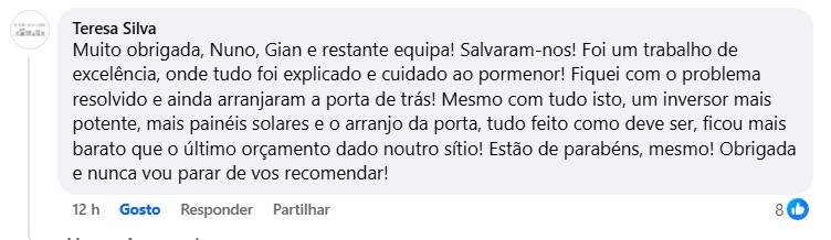 "Muito obrigada, Nuno, Gian e restante equipa! Salvaram-nos! Foi um trabalho de excelência, onde tudo foi explicado e cuidado ao pormenor! Fiquei com o problema resolvido e ainda arranjaram a porta de trás! Mesmo com tudo isto, um inversor mais potente, mais painéis solares e o arranjo da porta, tudo feito como deve ser, ficou mais barato que o último orçamento dado noutro sítio! Estão de parabéns, mesmo! Obrigada e nunca vou parar de vos recomendar!"