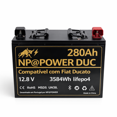 A bateria NP@POWER DUC 280Ah foi desenvolvida para oferecer máxima autonomia e fiabilidade em autocaravanas, especialmente modelos compatíveis com Fiat Ducato. Utiliza células prismáticas LiFePO4 (fosfato de ferro-lítio) de alta qualidade, garantindo elevada durabilidade, segurança e desempenho superior em comparação com baterias tradicionais.